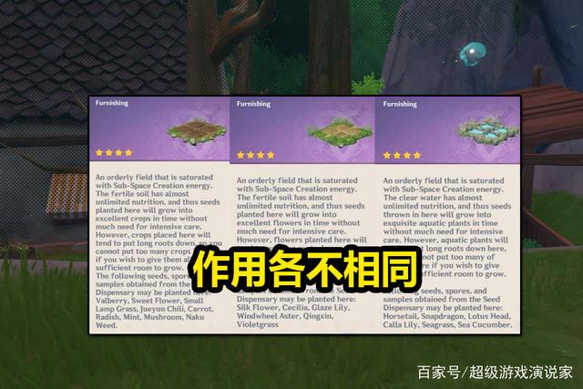 既然要实现种材料的玩法,就必须有耕地的存在,对于这一点,想必玩家们都心知肚明。为了和现实相契合,原神2.0版本上线后,将会有3种不同的耕地出现,分别为玄此玉田、薿此芝田和楚此渚田。从耕地的名称来看,让人有种晦涩难懂的感觉,但从不同种类的图示来看,却能大概了解这些摆设,都对应着哪些作用。从左往右依次来看的话,对应着湿地、旱地和水田的特点,说明每个耕地种植的材料,肯定是各不相同的。原神中的水田中,可以种植海灵芝、海草、嘟嘟莲这样的材料。也就是说,所有沿着水边生成的材料,都能够种植在里面。