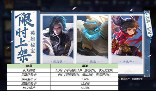 那么这一次官方虽然没有上架皮肤秘宝活动,但是却上架了英雄秘宝活动,我们可以看到此次上架的三个英雄是司马懿,盾山和李元芳。