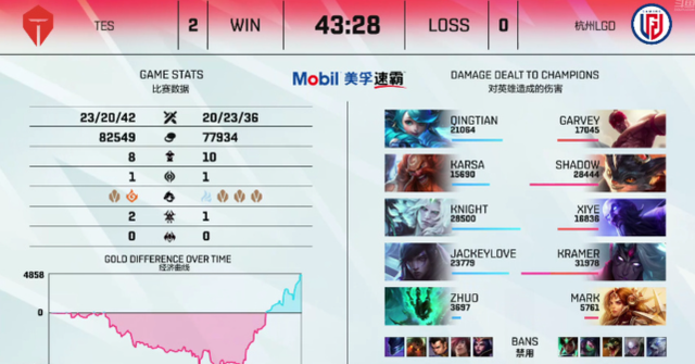 在这2-0战胜LGD的比赛里,TES的中单Knight收获了两个MVP,第一把关键团战完美绕后的阿卡丽,还有第二把打出了完美战绩11-3-3的破败之王,尤其是在关键时刻回家守基地的决策!这也能够看出在这个版本里,Knight已经找回那熟悉的自己,真的太能Carry了,期待TES后续的精彩表现!