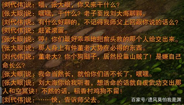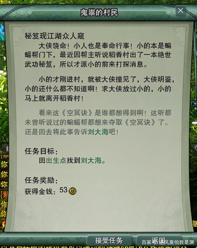 当你打空血条后,村民跪地求饶,头顶会出现一个任务卷轴,点击后会发现,呵!原来是一个号称蝙蝠帮的小喽啰来村里打听空冥决的下落,去找大海师傅交任务。