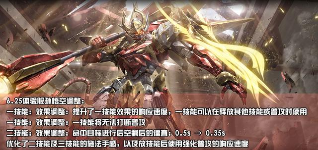 那对于孙悟空则加强最明显的当属释放一技能,以前很多人玩猴子都会发现这猴子开启一技能之后的一段时间之内无法普攻或者普攻被中断的效果,因此这样的手感并不舒服,疯狂点普攻键那一棒就是敲不下来。但这次提升了一技能效果的反应速度,可以做到立刻打出强化普攻。其次二技能遇到目标后跳跃的硬直时间也进行缩短,将手感优化之后,猴子敲人的速度和时间将会迅速不少。