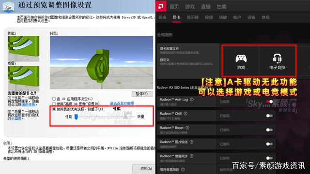 (3)在显卡驱动里面,把图像“质量到性能”的侧重横条,全部拉给性能,此设置仅适用于N卡驱动。A卡驱动没有这类选项,方便起见,可以直接选择“游戏模式”或“电竞模式”。