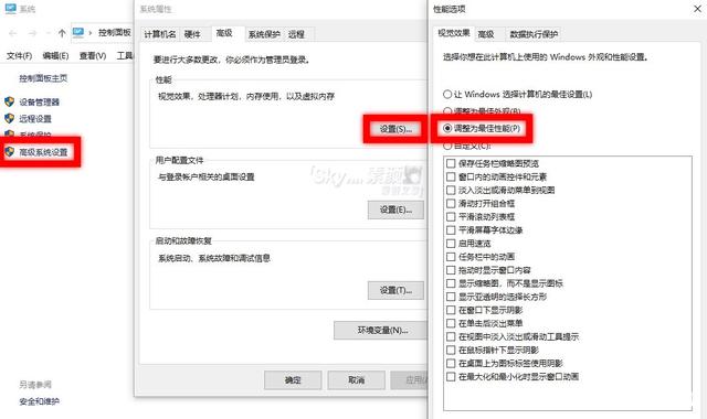(2)在我的电脑-高级系统设置中,把视觉效果调整为最佳性能。