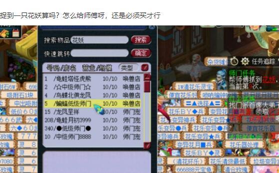 大家在梦幻中碰到过萌新吗?小编经常会看到某些萌新玩家向梦幻西游的老玩家求助,就像上面的这位做师门任务的玩家,师傅要求他抓一只花妖,但是上面这位萌新玩家想知道在商户中购买的花妖跟自己抓的花妖有什么区别?拥有了花妖之后要怎么给师傅?还有就是在商会中哪些店铺是出售花妖的?小编给新人玩家一个建议,那就是在商会中的这些师门宠物店铺的名字,大多都是按照召唤兽的参战等级来命名的,寻找时就按照师傅所要求上交的召唤兽的参赞等级去寻找就可以了,一般分为低级,中级和高级,最高就是龙凤。