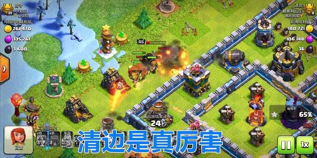 这位小伙伴还是很有经验,一看中间区域武神有跑偏嫌疑,马上用蛮王开始清边,而中间区域的武神也只能往大本营的方向进攻,但是这一来一回当误了太多时间,武神的血量也被“多头地狱塔”和“大本营”消耗得差不多了。