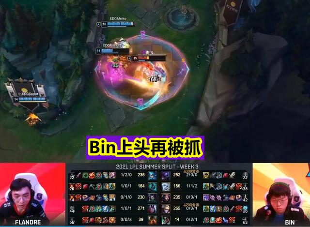 其次,这局的比赛,上路两人都是没有带闪现的,所以还是比较容易被抓,而bin玩贾克斯在被sofm帮了两次拿下两个人头之后,每次都想要对线去进行单杀,结果也是被EDG这边找到机会直接带走,有一说一,bin这样真不是一次两次了,每次都特别容易上头,这是他的一个很大的问题。