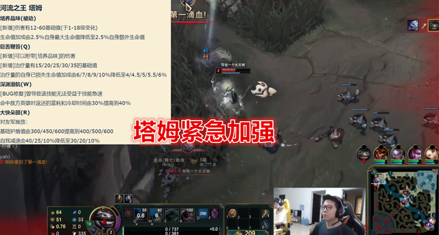 塔姆可能是最失败的重做英雄,一个冷门辅助被拳头强行重做,WR技能对调以后又没啥强度,不能保人对拼能力差打野又慢,整个峡谷已经没有他的容身之处,好几个上单主播在试玩新版塔姆以后都称他是个笑话!因此设计师对塔姆紧急加强,Q附带被动伤害,治疗量也有了基础值,但实战效果估计也就那样,对线打不过战士,团战作用不如坦克,英雄定位依旧尴尬,设计师是希望塔姆不吞人也能待在辅助位置吗?
