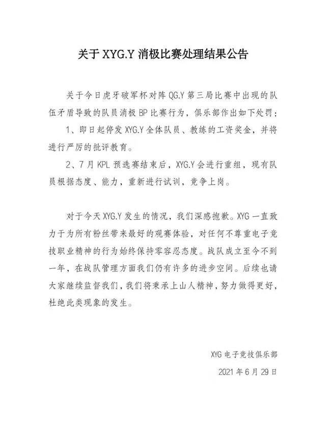 而比赛结束之后,XYG俱乐部也对于本场比赛进行了回应,指出了队员们存在消极比赛的事情。张大仙非常愤怒,对选手们和教练组进行了严厉惩罚,先是停止选手们后续工资等的发放,并且在世冠预选赛结束之后,将会对二队进行推倒重建,保留那些有能力,有上进心的选手,至于那些捣乱的成员,就只能辞退了。