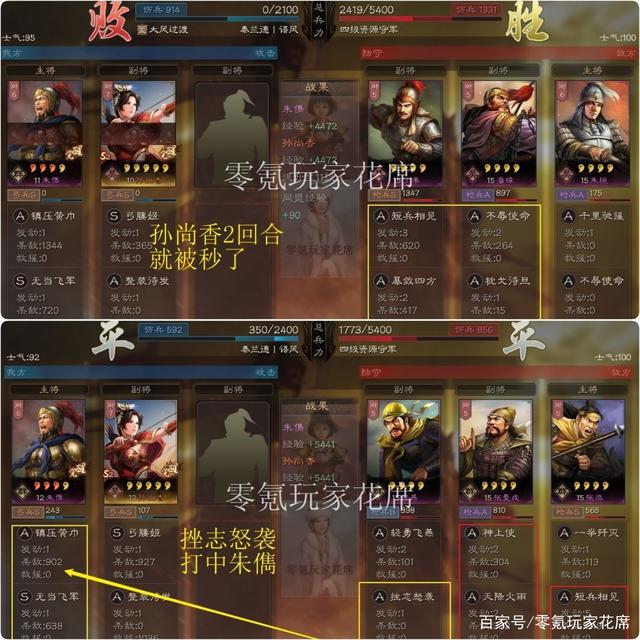 由于花席没裸衣血战,所以带的文武+合军聚众,张梁2次一举歼灭,4次飞燕,几乎都奔着孙尚香去的。
