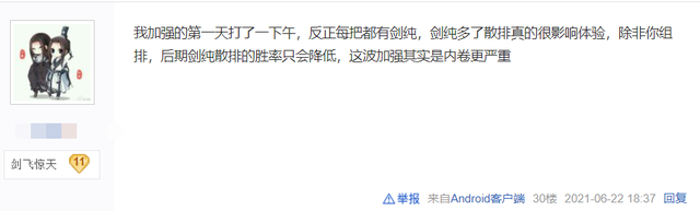 这种情况也出乎了不少剑纯玩家们的意料,他们本来觉得自己是来“称霸竞技场”的,却没想到每一场都能排到同门,游戏变成了同门之间互相剑飞的无聊局面。有剑纯玩家表示,剑纯实在是太多了,以至于现在剑纯陷入了“内卷”之中:每一场都能排到同门,这就意味着要不就是对方剑纯从自己那里吃分,要不就是自己从对方剑纯那里吃分,反而令他们的上分体验下降。