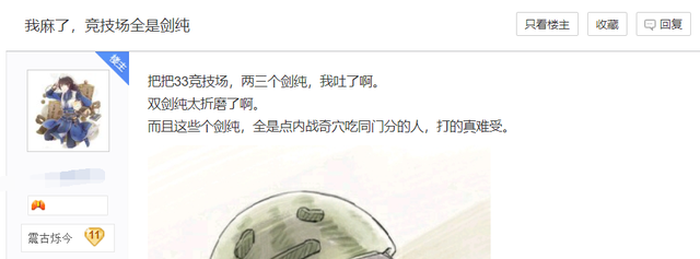 剑纯多了之后,常常会出现这一边和对面都有剑纯的情况,而且这些剑纯点的都是剑飞。所以就出现了这样一种情况:竞技场一开打,两边的剑纯就撂下了队友在互相剑飞,仿佛进入了“二人世界”。而剩下的4个玩家自己打自己的,感觉像是在打22。甚至有的局面,奶妈一进去发现队友居然是双剑纯组合,而对面也是双剑纯组合,心情直接进入低谷。