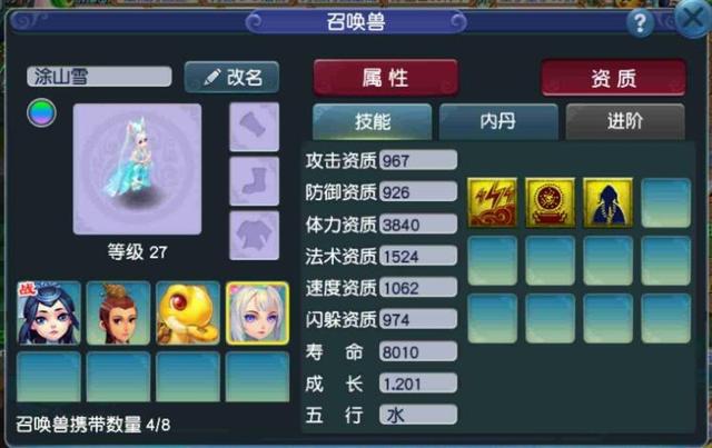 上面这只涂山雪虽然只有三个技能,但是这三个技能中却包含着出其不意和善恶有报双特殊技能,其实这就是合成出其不意召唤兽最划算的方式,先找两只技能数量比较少,但是又有特殊技能的召唤兽,这样合成时就有可能会合出其不意再加其他的特殊技能,合出来之后再选择一只多技能的召唤兽进行回炉,通过这样的方式获得出其不意+其他特殊技能召唤兽的成本是最低的。