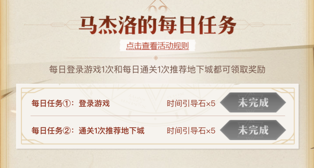 马杰洛的见面礼,奖励时间引导石,普通玩家100个,幸运玩家200个。按照一次副本18个时间引导石计算,普通玩家5次,幸运玩家10次,运气好点,能打11次。一个角色的疲劳能打一半。