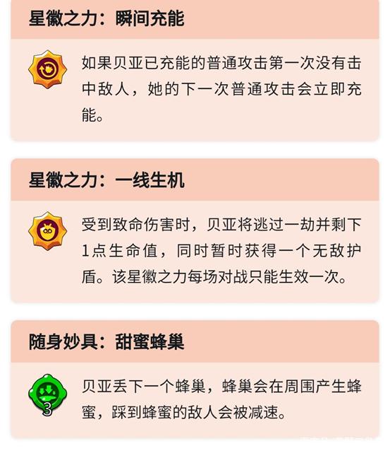贝亚的星徽之力第一个是可以让贝亚的强化普攻效果留存下来,如果强化普攻打空了,下一次普攻会立刻充能,这无疑是增加了不少贝亚的容错率,跟贝亚极度契合。而贝亚的第二个星徽之力则显得稍微有些鸡肋,会给贝亚一个保命效果,收到致命伤害的时候会逃过一劫,并且获得一个无敌护盾。