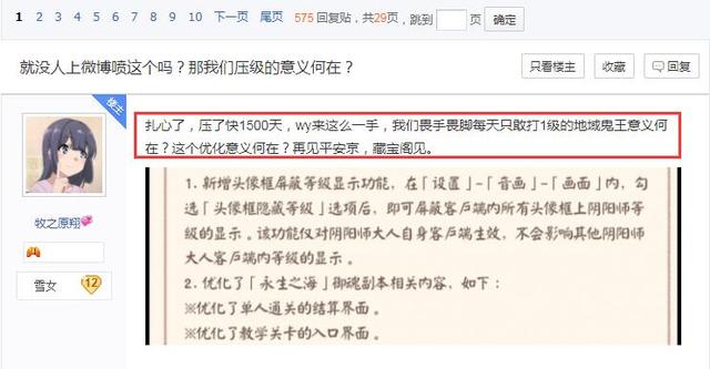 当然,也有一些压级玩家纯粹是为了结界突破,自己等级低的话,对应的结界突破会简单一些。而在这条公告发布出来之后,确实也出现了压级大佬破防的情况。有位压级玩家发文声讨阴阳师官方策划,表示自己压级1500多天,每天畏手畏脚玩着游戏,现在却被官方搞这么一出,别的玩家如果开启了这个功能就看不到他的低等级了,自己辛苦了这么久,不就是让别人看到自己的低等级高练度号,喊一声“压级大佬好厉害”的吗?现在却像个小丑。