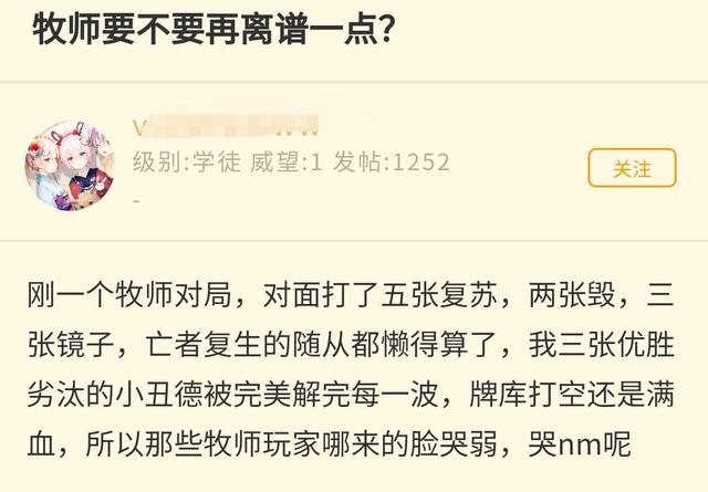 实际上牧师在传说之前的表现一般,当然这与玩家们的熟练度有很大关系。想要练好牧师这个职业并不容易,其首要原因是你需要比你对手更了解他所使用的卡组,这往往预示着你需要先经历各种卡组的毒打,然后才能慢慢掌握到牧师这个职业的精髓。比如什么时候要加快节奏,或者什么时候补资源,而且牧师并没有固定的出牌套路,很多时候需要根据场上的局势来做出判断。