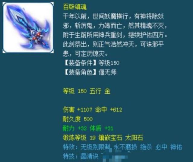 150级的装备是无级别限制有可能会出现的最高等级,所以现在在梦幻中有很多大佬会批量的鉴定150级的装备,上面的这把150级的武器是假的,因为他拥有的蓝字效果太多了,而且本身的伤害属性还特别的高,这把150级的武器拥有着无级别限制,永不磨损、绝杀、必中,神佑和晶清诀六个蓝字效果,现在镶嵌了19级的宝石,目前的总伤害达到了1311,比现在梦幻中所有武器的伤害都高,如果上面的这把武器是真的,梦幻中的那些无级别大佬可以退坑了,因为这把武器就是无级别的天花板,而且没人能够超越。
