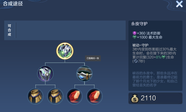 而最后一件装备建议出一件永夜守护。这件装备可以增加法术防御,同时在丢失30%生命值时,可以快速回复生命值。后期的法师伤害比较高,这件装备可以让杨戬能抗揍法师更多的伤害。同时利用自己的大招来恢复,让杨戬后期不容易被秒杀。