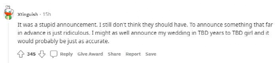 网友对于不同的游戏公司是会有不同的心理预期的,某些公司就喜欢闷声大发财,等到游戏快做完才公布消息,比如R星,虽然此前一直有传言,但是直到2016年十月份他们才正式公布《荒野大镖客2》,虽然原定2017年秋季的发售日,最后因为各种原因跳票到了2018年,不过这款游戏开发时间长达8年,官方宣布的时候已经算是开发阶段的后期。