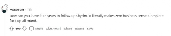 “你们怎么能时隔14年才出《上古卷轴5》的续作呢?这完全没有商业意义,全**搞砸了。”