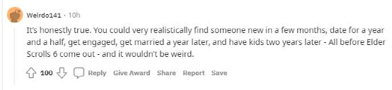 “这是当然,你可以在几个月内找到一个新对象,约会一年半,订婚,一年后结婚,两年后生孩子,而这些都可以在《上古卷轴6》发售之前完成。”
