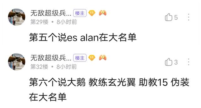 另外,LGD大鹅这边,因为上赛季的成绩并不是特别好,主教练15岁确实也难辞其咎,所以15岁教练下课了,不过他并没有直接离开LGD大鹅,而是转任助教。而RW侠这边呢,原本的首发对抗路洋洋不仅无缘首发,甚至连大名单都无了,而渡劫将重回首发,而且渡劫不打野了,固定边路了。estarpro这边呢,Alan也登上世冠大名单了,着实令人意外,Alan都多久没有上过场,而且也很久没有跟训了。