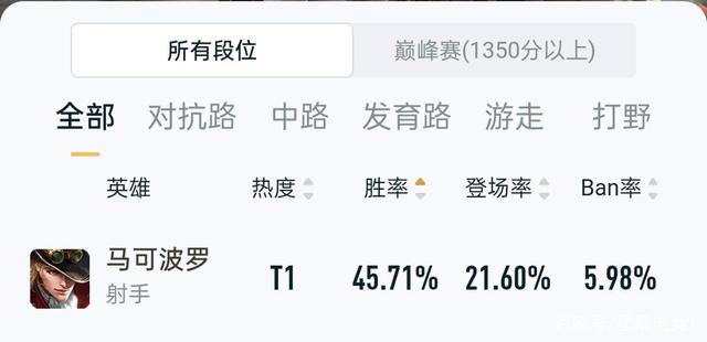 从数据中我们可以看到马可有着21.6%的登场率,这说明很多玩家还是喜欢这个英雄,拿他来上分,但是因为英雄机制的调整,却是让他胜率掉至全英雄倒数第一,只有45.71%。
