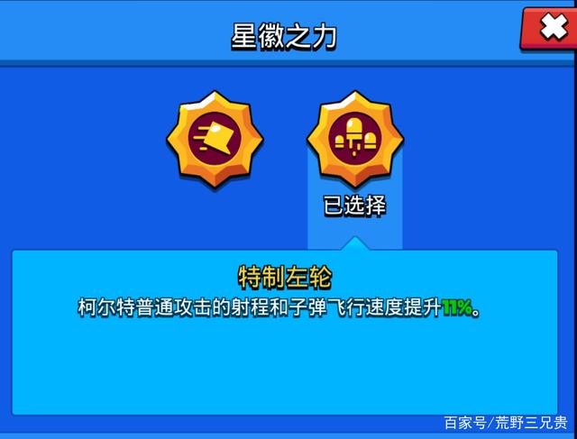 柯尔特有两种星徽之力,一种是提升11%的射程和子弹飞行速度,另一种则是提升10%的移速。
