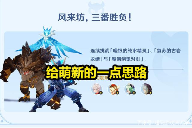 “风来人剑斗绮谭”的活动中,出现了3个游戏boss,他们分别是古岩龙蜥、纯水精灵,以及原神1.6版本更新后,上线的魔偶剑鬼。对于老玩家来说,可能这些boss不算什么,通过角色的高练度,通关只是分分钟的事情。但对新手玩家而言,无疑会增加通关的难度,还没坚持到和魔偶剑鬼见面,就已经被古岩龙蜥按在地上摩擦。通过以往的观察来看,每次牵扯到古岩龙蜥的时候,通常是以2个以上数量出现的。没有套盾角色,或者强力阵容搭配的情况下,被锤爆是常有的事。那如何来解决这一点呢?为了萌新玩家考虑,这里分享一个通用的方法。