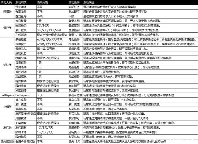以上活动类型只做参考,不包含所有。另外在这里面battlepass比较特殊,可谓是运营活动的新星,所谓Battle Pass(又称“通行证”),指的是游戏内一个依托于一定时间周期的玩法、包含活跃设计和付费设计的商业化系统。更具体的内容不在本文细说。