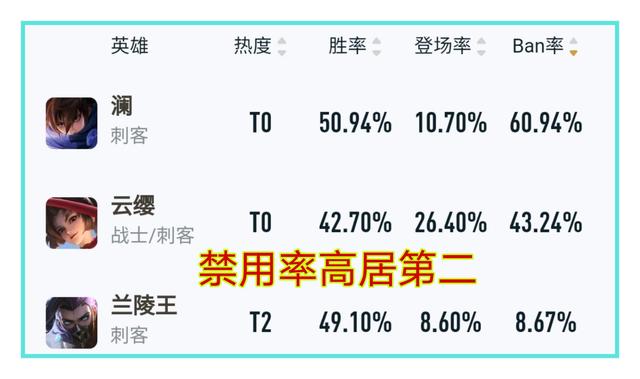 云缨的Ban率也是很高的,但从现在的表现看来她Ban率高的原因不是因为她非常强的原因,而是因为害怕队友拿到这个英雄,一方面是害怕队友练英雄,另一方面则是就算队友没有练英雄,云缨的强度还是不高,所以就直接给禁了,队友就不能拿到这个英雄了。