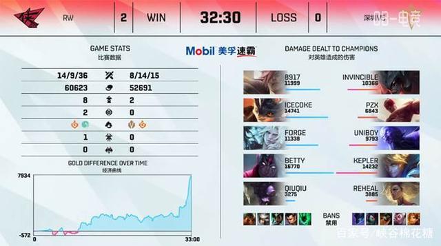 十一分钟瑞兹被RW上下包夹击杀瑞兹,佛耶戈捡起灵魂后又越塔击杀芮尔,前期的一来一回打到现在让RW又占据了优势,十五分钟上路剑魔单杀腕豪,和瑞兹一起吃了上路一塔也算是补回一些经济,二十一分钟RW想再抓瑞兹,但瑞兹丝血金身等到了队友到来,最后双方打野做出一波互换,二十四分钟RW想开团但牛头侧面闪现磕头,本来能打赢的一波硬是打出了一换一;三十分钟RW卡主视野差顺利拿到大龙,而后RW下路再开团尽管开的并不太好但经济差距略大一波零换四盲僧躲在泉水看着RW推平自己的基地。