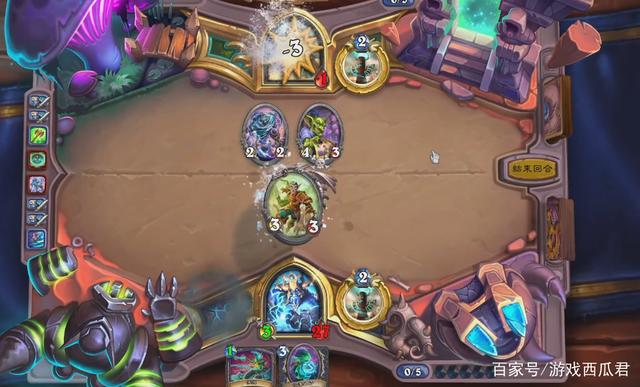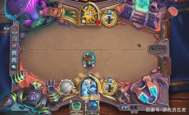 值得一提的是,这里的锤子直接怼脸就好了,绝对不要贪,不要想着等加攻的几张法术牌。一个原因是,这就是卡组的特色,2费直接开锤,基本上这把武器锤完了,下一把毁灭也在路上了。并且我们手中也有许多的法伤可以做到斩杀效果。最重要的是环境中的小软比较多,可能下回合就被吃刀了,所以这里的小贪是没有必要的。