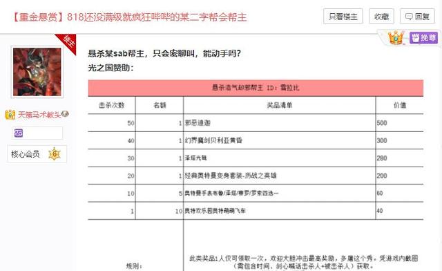 可能考虑到大部队都还在升级,都是中立玩家的身份,还没有加入阵营,玩家之间不加入仇人名单,暂时没办法击杀对方。为了能够让对方在游戏里吃些苦头,恶人帮主怒砸千金,拿出了自己珍藏的奥特曼发布了这个悬赏贴,号召大家在游戏中悬杀对方帮主。最高一个奥特曼奖励价值500块,条件则是需要在游戏里杀对方50次,留图为证。