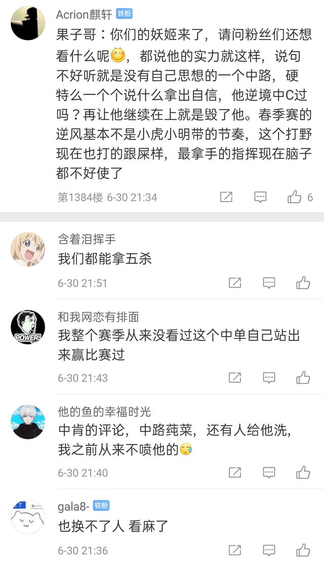 对于TES和RNG的这场比赛来说,粉丝们对于中路果子哥也是再也不抱希望了。当他拿出妖姬的时候观众们还是有些期待的,毕竟他也是用妖姬打出过名场面。然而让粉丝们失望的是,好不容易拿出刺客中单的RNG又输了,而果子哥的妖姬也是直接让观众直呼下饭。目前RNG官博沦陷,果子哥被疯狂嘲讽:看来我们的妖姬都能拿五杀。