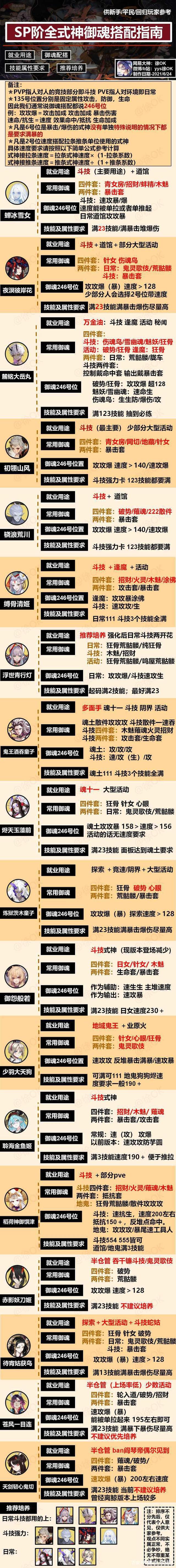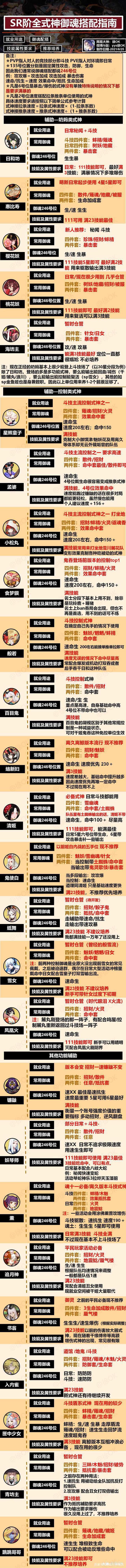 内容包含:就业用途,御魂推荐,246号位置佩戴,属性要求,技能及备注说明,推荐培养。看起来密密麻麻的,但是都还是挺干货的。