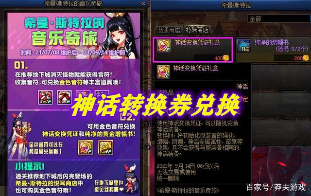 新活动“希曼的音乐之旅”中,玩家可以凭借400个金色音符兑换神话转换券,和大飞空时代中的转换券一样,但有所不同的是,体验服爆料中,神话转换券竟然没有设置兑换次数,也就是说,只要你愿意爆肝,那就可以转换许多次。