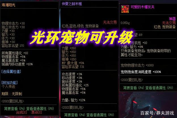 而除此之外,今年夏日套的宠物和光环都可以进行升级,升级后属性基本可以持平年套宠物和国庆光环,如此强大的原因,估计也是为了照顾新职业刃影,毕竟一个新角色,如果没有宠物和光环,肯定是打不了团的,所以今年夏日套的宠物和光环也算一个吸引小号的卖点。