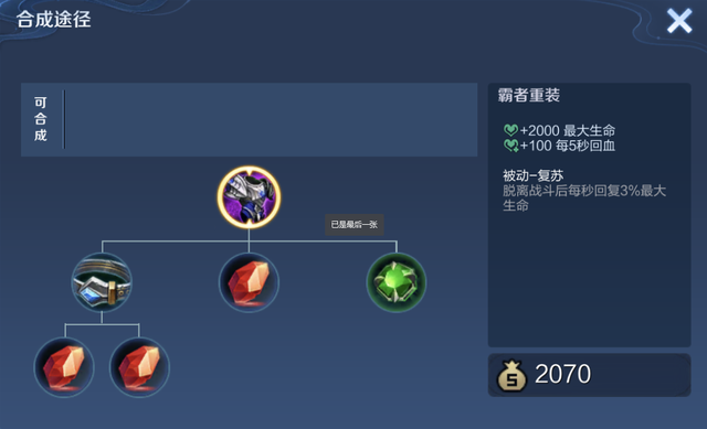 最后一件装备选择一件霸者重装,这件装备可以增加2000值,有利于刘邦发挥出被动技能的最高伤害,同时还带有回血效果,对于刘邦后期的坦度提升,有极大的效果。