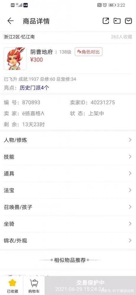 可以看到帐号的信息为等级138,成就1937,总修60,总宠修34,263个收藏,历史门派4个。然而他的价格仅仅是300R,妥妥的买到绝对是赚到。