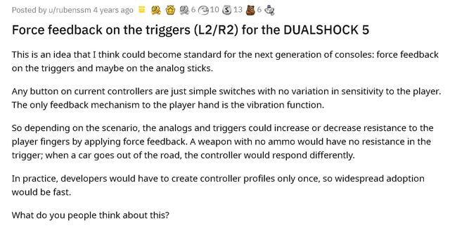 PS5手柄dualsense是当今最好的游戏控制器之一,它的特色是拥有触觉反馈和自适应扳机,没想到的是,早在4年前,就有网友向索尼建议了这一点。