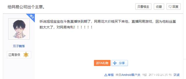 在近日逆水寒贴吧就有位网友发帖讨论,说如果旭旭宝宝直播逆水寒会怎么样?一时间引起了巨大的热度。有玩家从签约费上考虑,像旭旭宝宝这样的大主播,要是直播逆水寒,网易得要出多少钱才能拿下?对此有吧友不屑一顾,一个亿就能将旭旭宝宝拿下。虽然这些主播的身价很高,但实际签约是有很高的可操作性的。