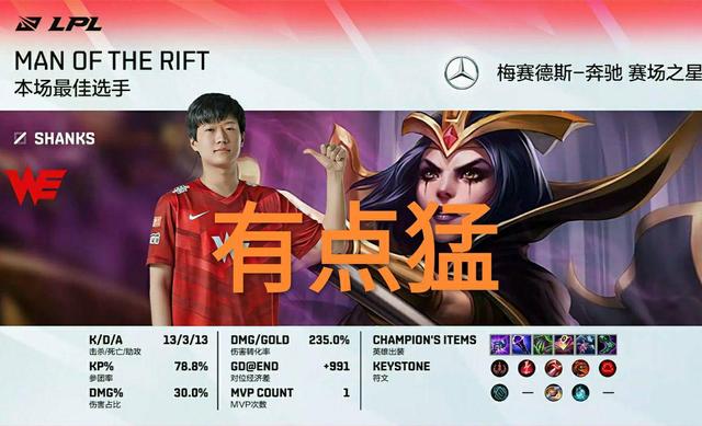 先是前期we战队拿到了非常不错的优势,在经济领先的情况下,we战队团战中出现了很多的失误操作,尤其是在关键的小龙对抗中,第三条龙的丢失,让we战队的龙魂来的非常的晚,卢锡安的几波进场失误,让blg战队的装备直接追赶上来了。在最后关键的时刻,香克斯的妖姬发挥出了最完美的操作,团战的一波四杀,让we战队直接奠定了胜势。之前马老师和957还在不断地调侃,Blg战队的采访过程,果然两个人的做法还是有用的,最终we战队也是打出了一个让一追二,终结了自己的连败。