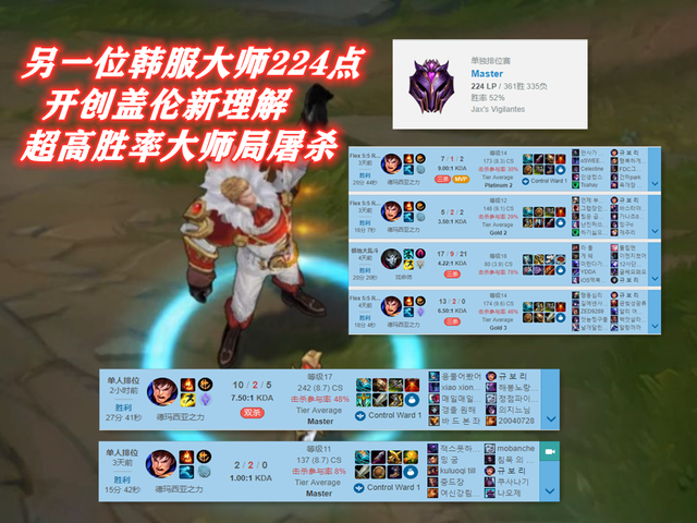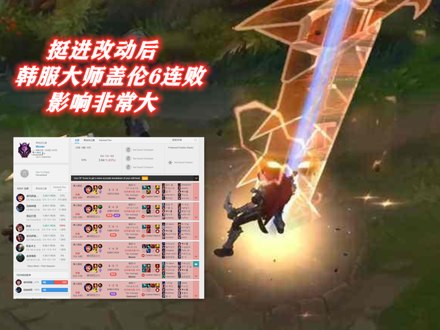于是风尘去查询了,韩服大师以上分段的几位盖伦高级玩家,最终发现,出装两极分化十分严重,还延续上个版本出装方式的一位大师112点的玩家,在挺进改版之后,迎来了6连败,可以说是数据的可靠性并不强。