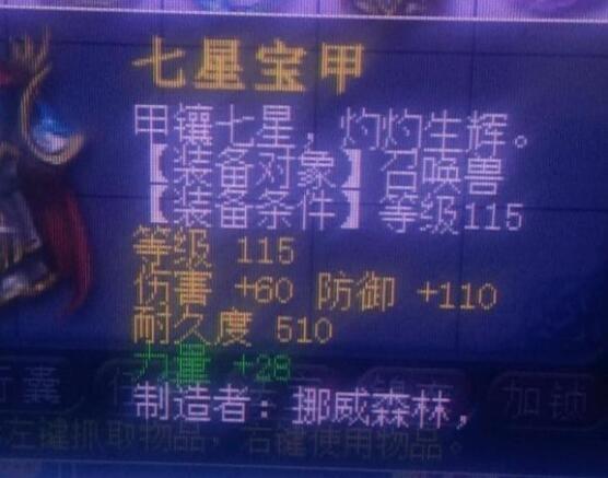115级的满属性召唤兽装备,防御、伤害、力量都是满的