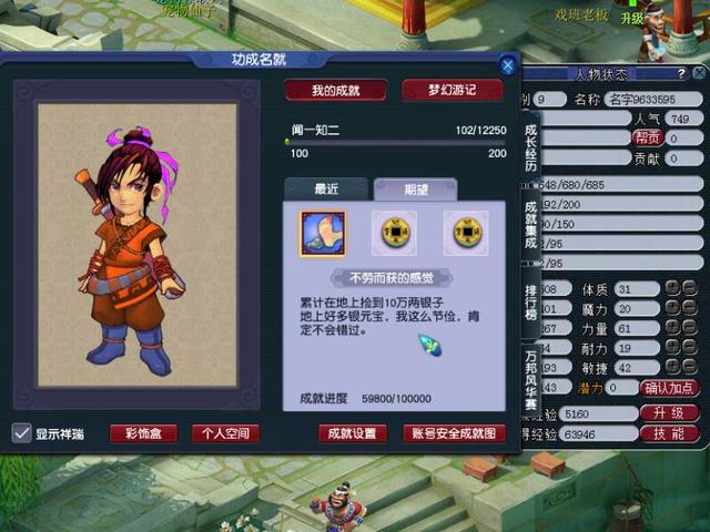 上面那位玩家角色的等级是九级,只有当年创建的这种老角色才不会自动升级,而且这位玩家的角色昵称绝对违规过,所以才会变成名字加角色ID的格式,这样的九级角色,、现在在梦幻中也是有优势的,那就是刷耗时比较长的成就,上面的这位玩家目前正在刷的成就是在地上捡起十万两银子,这样就需要该角色在东海湾、建业城逛特别长的时间。