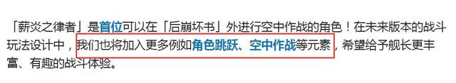 从崩坏3对于薪炎之律者的介绍来看,她不仅是首位可以在“后崩坏书”外进行空中作战的角色,同时在未来的版本玩法中,米哈游的策划也表示会出更多的可以在空中战斗的角色,从而丰富游戏目前较为单一的玩法。不过因为崩坏3和原神才进行了菲谢尔、刻晴等角色的联动,所以这次玩法的创新无疑让人联想到了原神中的角色来。