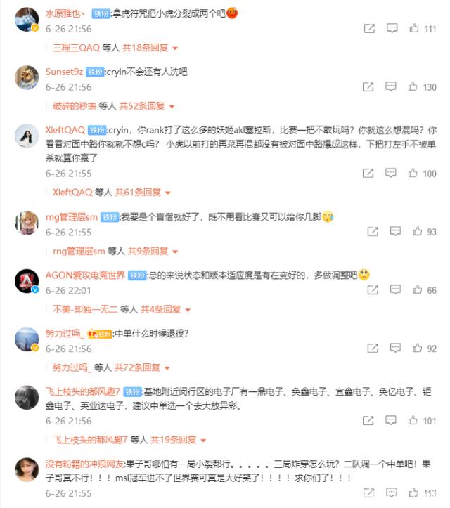 正因为cryin如此的糟糕表现,赛后RNG官博下面的留言及其一致,那就是要换掉cryin,因为cryin的实力真的不是LPL中单的水平,不然RNG夏季赛走不远。
