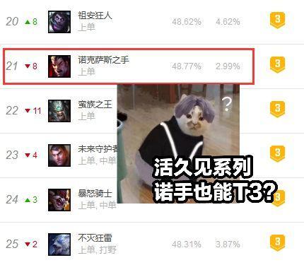 总的来说,虽然过几天诺手肯定会迎来一次反弹,排名再逐渐升回来,但想重现上个版本的荣光已经不可能了。而且这对其他玩家来说确实是舒服了不少,诺手这英雄常年霸占T1的位置不放,现在是该还还债了。
