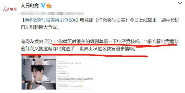 连人民电竞的官微也忍不住出来“拷问”,直接引用了网友的发帖评论:“你微笑时很美的编剧尊重一下电子竞技吧!”